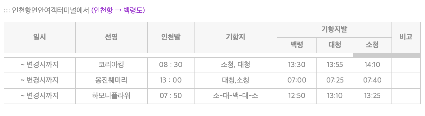 인천항에서 출발 하여 백령, 대청 소청을 거치는 운행표 입니다.